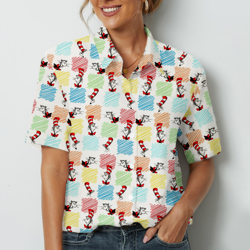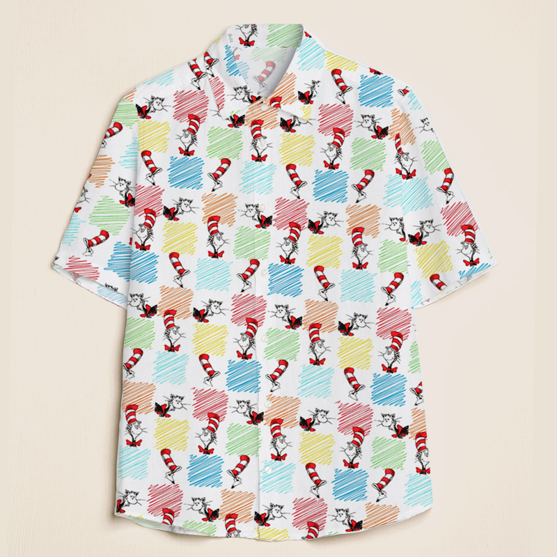 Colorful Plaid Cartoon Cat Teacher Short Sleeve Shirt