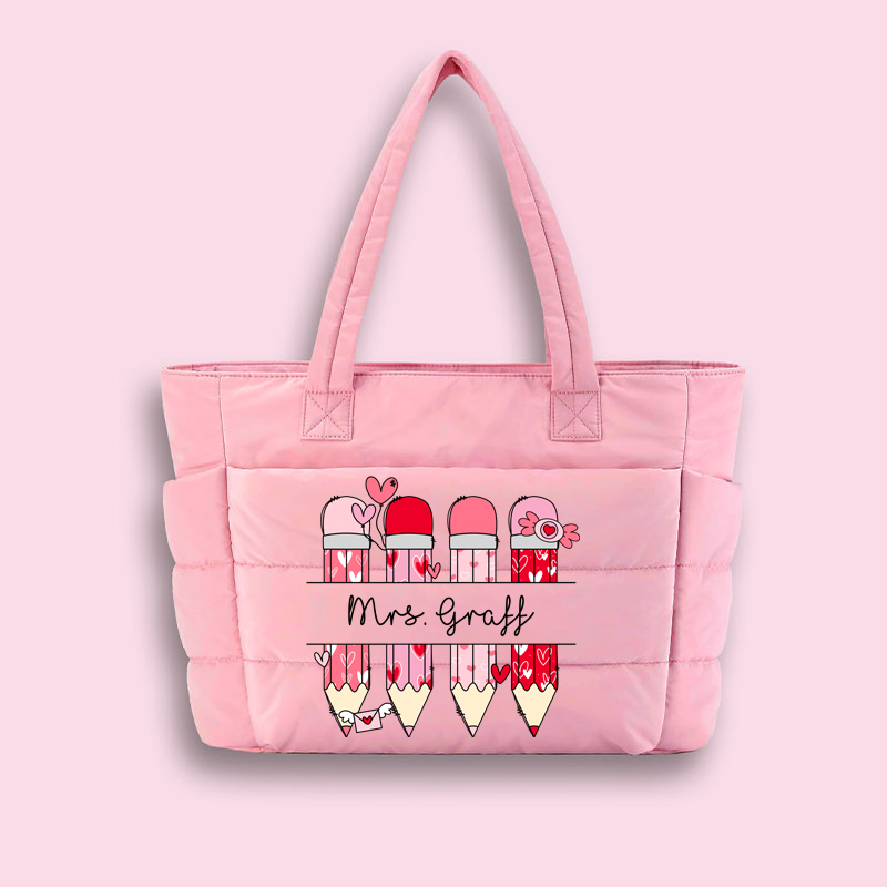 Personalized Pink Pencil Name Teacher Puffy Tote Bag